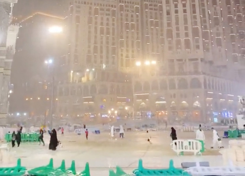 حرم شریف کے گردونواح میں پیدل چلنے والے متعدد زائرین تیز رفتار ہواؤں کی زد میں آنے سے توازن برقرار نہ رکھ سکے۔ راہداریوں کے اطراف رکھے پلاسٹک کے حصار بھی تیز ہوا کے سبب پھسلتے ہوئے نظر آئے۔