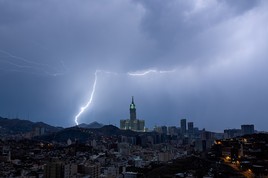 مکہ مکرمہ میں زبردست بارش کے دوران حرم مکی شریف کے سامنے کلاک ٹاور پر رات کے وقت آسمانی بجلی گرنے سے آسمان روشن ہو گیا اور زائرین نے یہ منظر دیکھا۔