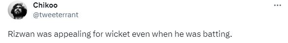 ٹوئٹر ہینڈل چِیکو نے تبصرہ کیا کہ ’جب رضوان بیٹنگ کر رہے تھے تو وہ اُس وقت بھی وکٹ کے لیے اپیل کر رہے تھے۔‘