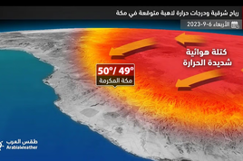 سعودی عرب میں موسمیات کے قومی مرکز نے کہا ہے کہ جمعرات 7 ستمبر 2023 کو سب سے زیادہ درجہ حرارت مکہ مکرمہ اور ینبع میں ریکارڈ کیا گیا جہاں پارہ 47 سینٹی گریڈ رہا جبکہ سب سے کم درجہ حرارت 17 سینٹی گریڈ السودہ میں ریکارڈ کیا گیا۔