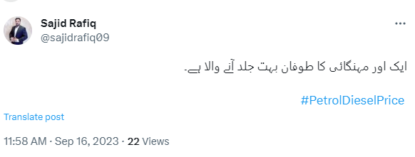 ’پیٹرول کی قیمت میں 26 روپے اضافہ ظالمانہ اقدام ہے جس کی وجہ سے متوسط طبقہ اور غریب مزید پِس جائے گا۔ یہ مہنگائی کا طوفان پی ڈی ایم حکومت کی غلط اور ناکام پالیسیوں کا تسلسل اور نگراں حکومت کا ان ناکام پالیسیوں پر عمل پیرا ہو کر عوام کا برکس بجلی، گیس ضرورت اشیاء اور پیٹرول کی شکل میں نکال رہی ہے۔ خدارا اس پسی ہوئی عوام پر رحم کرے کیونکہ یہ اور مہنگائی کا بوجھ برداشت نہیں کر سکتی۔‘
