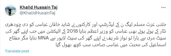 خالد حسین تاج نے لکھا کہ ’جتنی عزت مسلم لیگ ن کی لیڈرشپ اور کارکنوں نے شاہد خاقان عباسی کو دی، چودھری نثار کے ہوتے ہوئے بھی عباسی کو وزیراعظم بنایا، 2018 کے الیکشن میں جب اپنے گھر کی سیٹ مری سے ہارے تو نواز شریف نے اپنے گھر کی سیٹ لاہور سے ایم این اے بنوایا۔‘