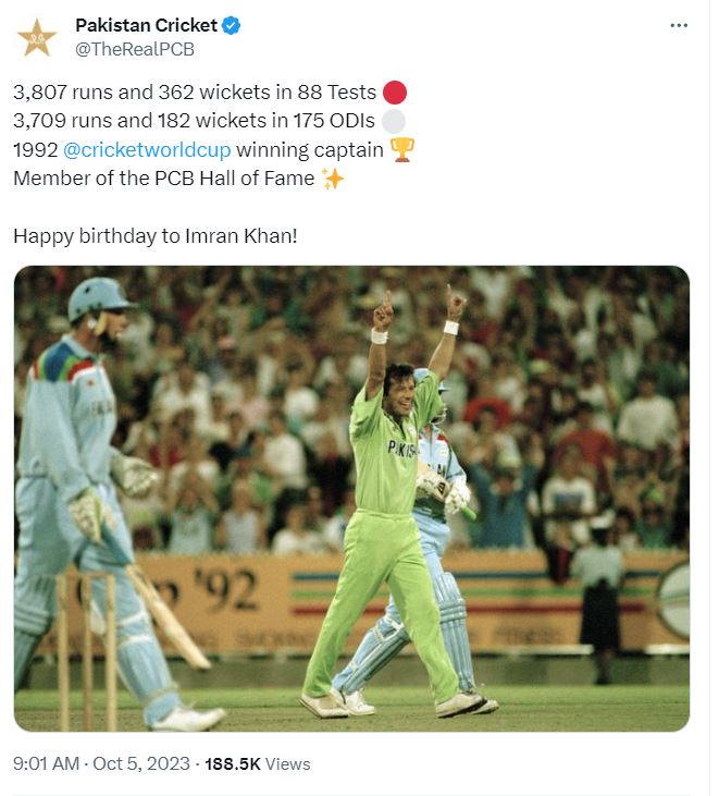 پاکستان کرکٹ بورڈ کی جانب سے سابق وزیراعظم اور پاکستان کرکٹ ٹیم کے سابق کپتان عمران خان کو ان کی سالگرہ کی مبارک باد دی گئی ہے۔