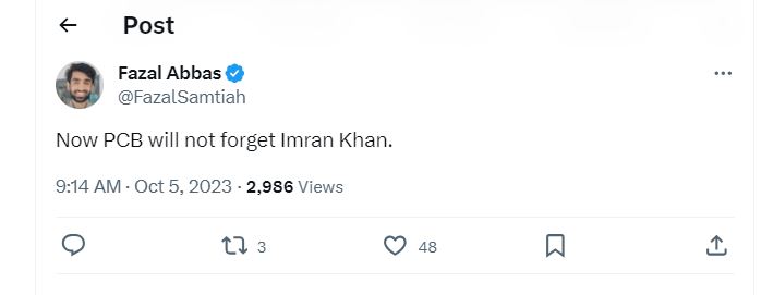 فضل عباس نے لکھا کہ ’اب پی سی بی عمران خان کو نہیں بھولے گا۔‘