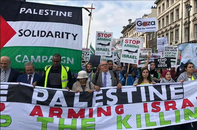 اسرائیل سے غزہ پر بمباری بند کرنے کا مطالبہ کرتے ہوئے فلسطین کے ہزاروں حامیوں نے ہفتے کے روز لندن اور دیگر شہروں میں مظاہرے کئے۔