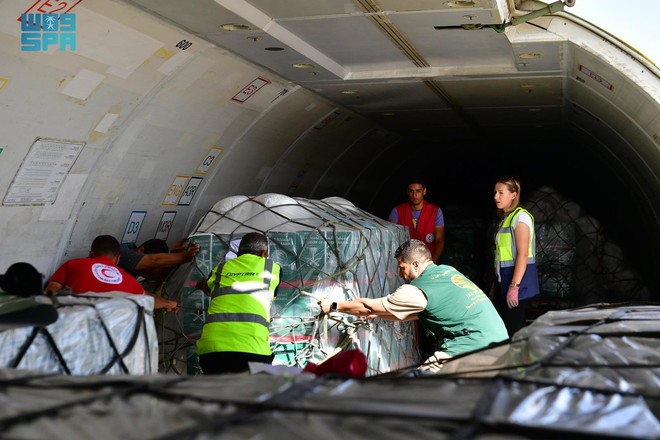 ہوائی جہاز کے ذریعے امدادی سامان کی ترسیل خادم حرمین شریفین شاہ سلمان اور ولی عہد شہزادہ محمد بن سلمان کی جانب سے غزہ میں فلسطینی بھائیوں کی مدد کے لیے عوامی عطیات مہم کا حصہ ہے۔