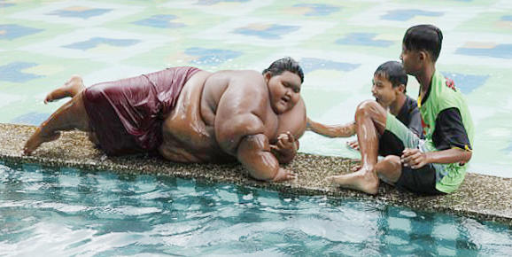 جکارتہ.... دنیا کے سب سے وزنی 10سالہ انڈونیشی بچے کا آپریشن کیا گیا جس کے نتیجے میں اسکا وزن 5اسٹون کم ہوگیا۔اسکا وزن 190 کلو گرام کے لگ بھگ تھا۔یہ بچہ کو کولا مشروبات اور نوڈلز سے رغبت رکھتاہے لیکن یہ روزانہ پانچ مرتبہ چاول اور گوشت کھانے کے باوجود بھی بھوک کی شکایت کرتا رہتا ہے۔ مٹاپے کے شکار بچے کی والدہ رقیہ اور والد ادے سومانتری اپنے بچے کی اس کیفیت سے فکر مند رہتے تھے۔ رواں برس 17 اپریل کو ہونے والے آپریشن سے پہلے آئرا 20 پاﺅنڈ وزن کم کرچکا تھا ۔ اس کے بعد اس نے مزید 37 پاﺅنڈ وزن کم کیا لیکن اب بھی وہ روزانہ، مچھلی، چاول، سبزیوں کا سوپ اور ایک ڈش ٹامپے ضرور کھاتا ہے اور کئی لیٹر سافٹ ڈرنک پی جاتا ہے۔ آئرا اپنے وزن کی بنا پر اسکول جانے سے قاصر ہے کیونکہ اتنے وزن کے ساتھ وہ اسکول تک نہیں جا سکتا تاہم گھر میں رہ کر ایک چھوٹے سے تالاب میں نہانا اس کا محبوب مشغلہ ہے۔ اپنے ناپ کے کپڑے نہ ہونے کی وجہ سے صرف دھوتی میں ملبوس رہنا پسند کرتا ہے۔ آئرا کو بھوک ختم کرنے والے خاص ہارمون بھی دیئے جا رہے ہیں لیکن اس کے باوجود ایک وقت میں یہ 3 آدمیوں کے برابر کھانا کھا رہا ہے۔ ڈاکٹروں کے مطابق اسے ایک اور آپریشن سے گزارا جائے گا اور امید ہے کہ اس سے وزن 100 کلو تک محدود کرنے میں مدد ملے گی لیکن یہ عمل کچھ وقت لے گا جو ایک سال تک ہو سکتا ہے۔