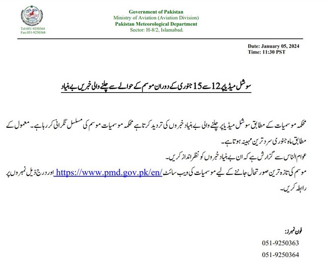 — Pak Met Department محکمہ موسمیات (@pmdgov) January 5, 2024