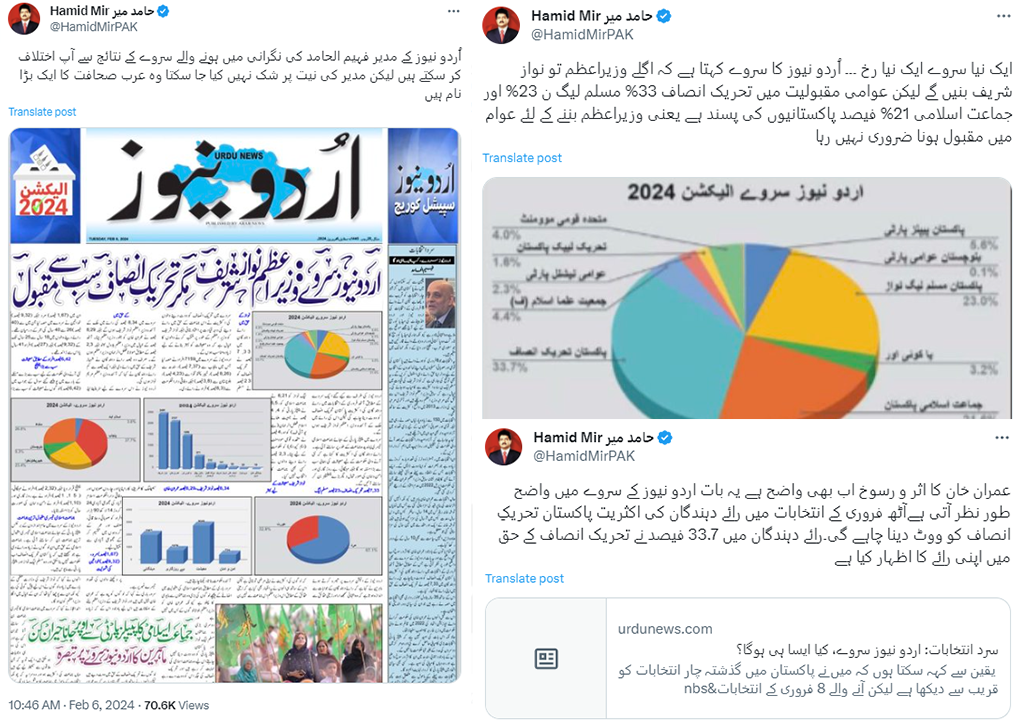 حامد میر کا مزید کہنا تھا ’اُردو نیوز کے مدیر فہیم الحامد کی نگرانی میں ہونے والے سروے کے نتائج سے آپ اختلاف کر سکتے ہیں لیکن مدیر کی نیت پر شک نہیں کیا جا سکتا وہ عرب صحافت کا ایک بڑا نام ہیں۔‘