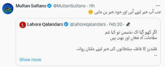 بدھ کے روز ہونے والے ٹورنامنٹ کے ساتویں میچ میں جب ملتان سلطانز نے سنسنی خیز مقابلے کے بعد لاہور قلندرز کو پانچ وکٹوں سے ہرایا تو ملتان سلطانز کی ٹیم نے لاہور قلندرز کی پرانی پوسٹ کا جواب دیتے ہوئے لکھا ’جب آپ خبر لینے آئیں اور خود خبر بن جائیں۔‘