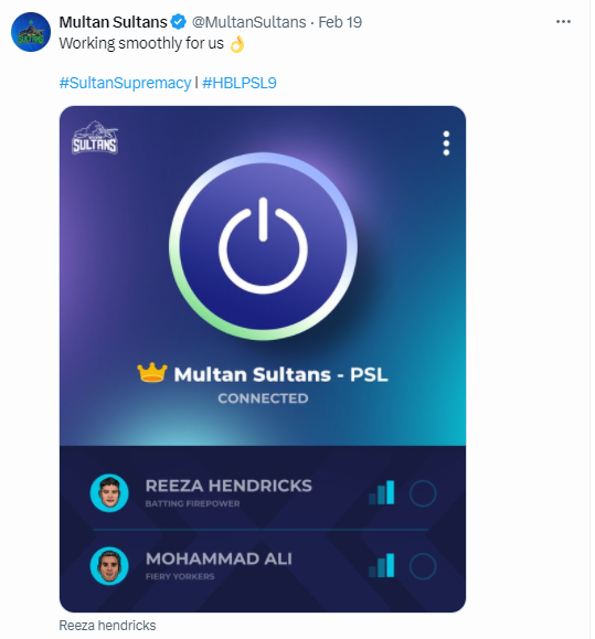 میمز اور ٹرولنگ پوسٹس کا سلسلہ یہاں ہی ختم نہیں ہوا۔ ملتان سلطانز کی ٹیم نے ایک اور پوسٹ کی جس میں وی پی این کے کنیکشن کو دکھایا گیا اور اس کے نیٹ ورک کنیکشنز میں ان کے دو کھلاڑیوں کے نام شامل تھے۔