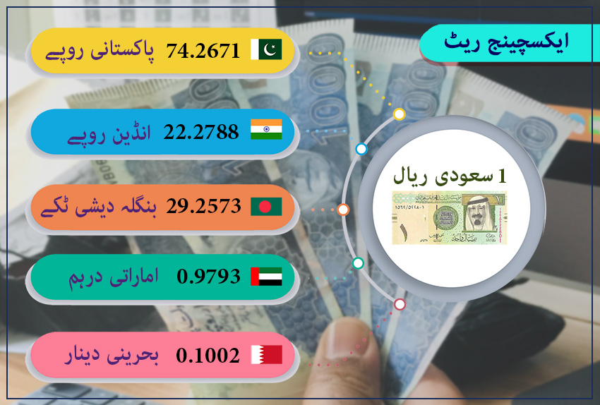 سعودی عرب کے مختلف ٹرانزیکشن سینٹرز کے مطابق جمعہ 22 مارچ 2024 کو سعودی ریال کا ایکسچینج ریٹ ذیل میں درج کیا گیا ہے۔