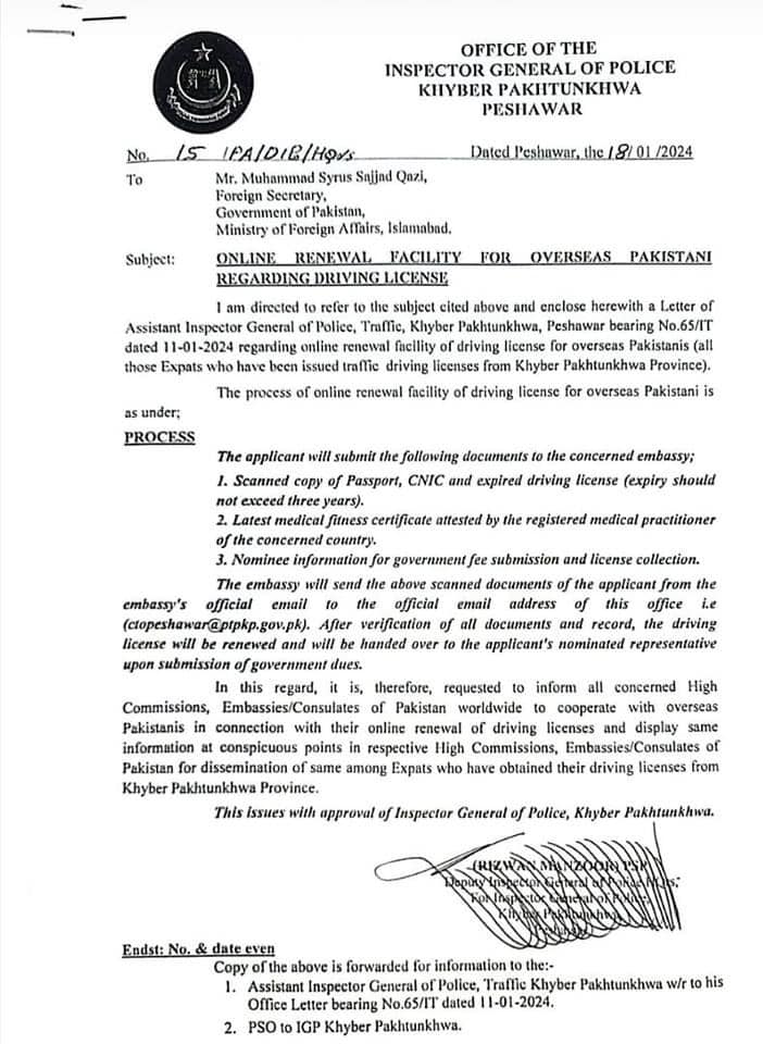 خیبر پختونخواہ کی ٹریفک پولیس نے بیرون ملک بسنے والے پاکستانی شہریوں کو ڈرائیونگ لائسنس کے آن لائن تجدید کی سہولت فراہم کی ہے