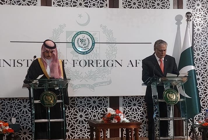 سعودی وزیر خارجہ فیصل بن فرحان اپنے پاکستانی ہم منصب اسحاق ڈار کے ساتھ اسلام آ باد میں پریس کانفرنس سے خطاب کر رہے ہیں۔ (فوٹو: فارن آفس)