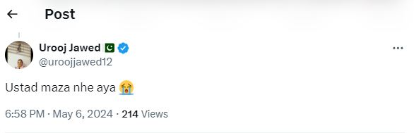ایکس صارف عروج جاوید نے اپنی پوسٹ میں لکھا کہ ’استاد مزہ نہیں آیا۔‘