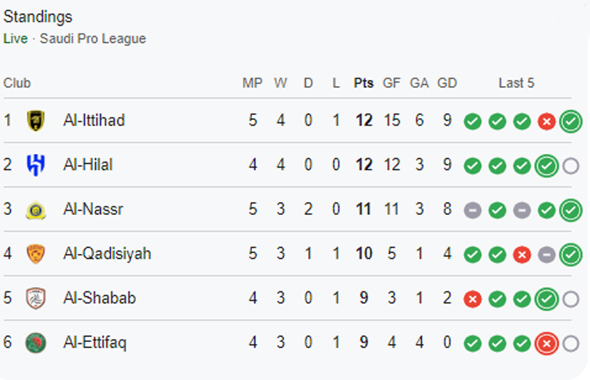 سعودی پرو لیگ میں جدہ کا اتحاد کلب جو دو سیزن پہلے چیمپئن تھا، اب پانچ میچوں میں 12 پوائنٹس کے ساتھ پوائٹس ٹیبل پر سرفہرست ہے لیکن اگر الھلال آئندہ میچ الخلود کلب کے خلاف کم از کم ڈرا بھی کھیلتی ہے تو دوسرے نمبر پر آ جائے گی۔