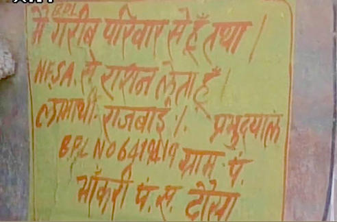 جے پور۔۔۔۔راجستھان کے ڈوسا ضلع میں بیشمار لوگوں نے اپنے مکان کے باہر پیغام لکھ کر لگایا ہوا ہے جس میں کہاگیا ہے کہ ’’میں غریب ہوں مجھے نیشنل فوڈ سیکیورٹی ایکٹ کے تحت راشن ملتا ہے‘‘۔ضلع پریشد ڈوسا کے سی ای او سریندر سنگھ نے کہا ہے اس کا مقصد خاندانوں کی طرف سے یہ دکھانا ہے کہ انہیں سرکاری راشن ملتا ہے اور یہ تحریر حکومت کی ہدایت پر لکھی گئی ہے تاکہ پتہ چل سکے کہ غربت سے نیچے لکیر پر کو ن سے خاندان رہ رہے ہیں۔ ان خاندانوں کو 10کلو گندم دیا جاتا ہے۔ ضلع کی 2تحصیلوں میں 50ہزار گھروں کے مکینوں نے اپنے گھر کے آگے اس طرح کی تحریر لکھی ہوئی ہے۔