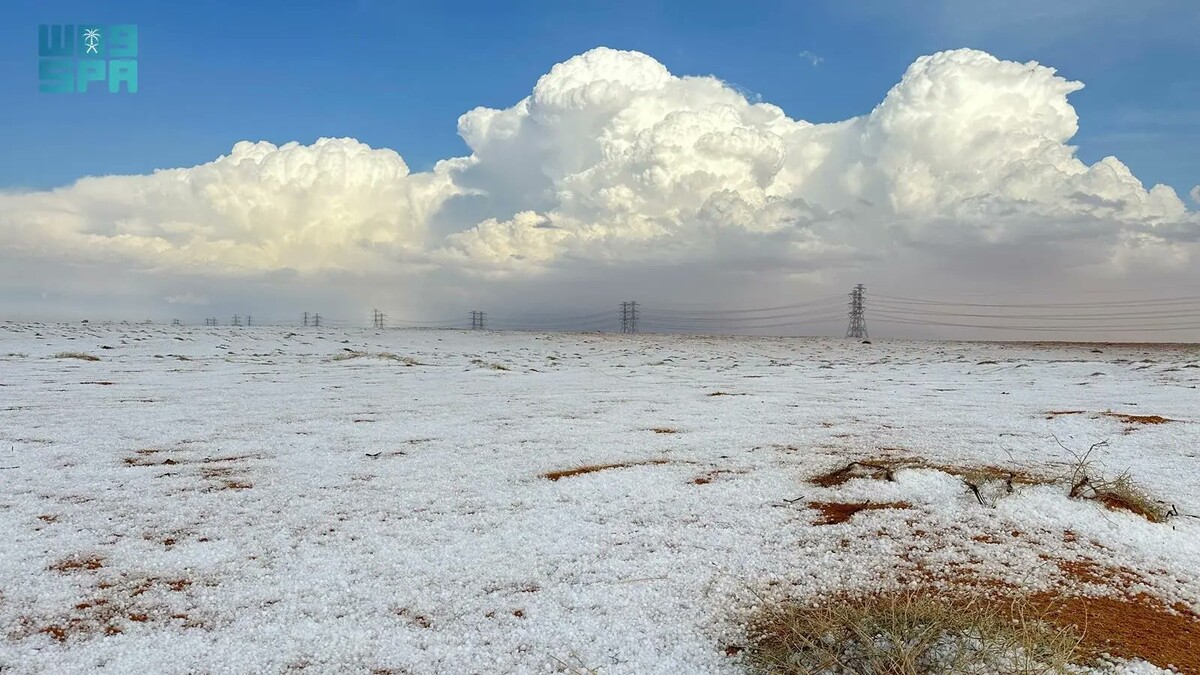 سعودی عرب کے الجوف ریجن میں سنیچر کو ہونے والی بارش اور شدید ژالہ باری سے متعدد علاقے برف کی طرح سفید دکھائی دے رہے ہیں۔
