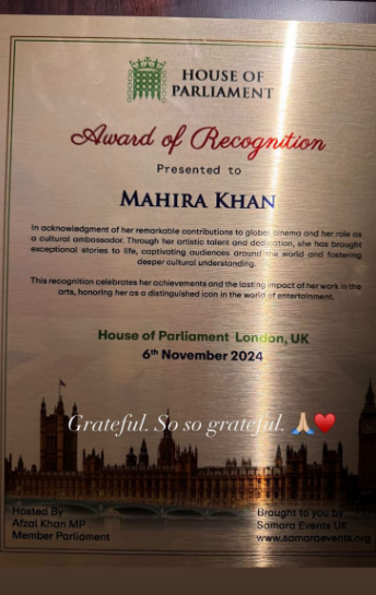 اداکارہ ماہرہ خان کی انٹرٹینمنٹ انڈسٹری اور خواتین کو با اختیار بنانے کے لیے کی جانے والی کاوشوں کو برطانیہ کی پارلیمنٹ کی جانب سے سراہا گیا اور انہیں لائف ٹائم اچیومنٹ ایوارڈ سے نوازا گیا ہے۔