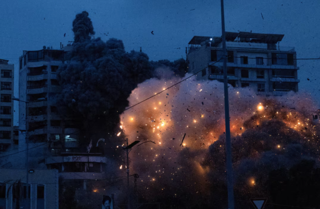 اسرائیلی فضائی حملوں سے پیر کو بیروت میں حزب اللہ کے زیرِکنٹرول جنوبی مضافاتی علاقوں کی عمارتیں تباہ ہو گئیں اور آسمان پر گرد کے گہرے بادل چھا گئے۔