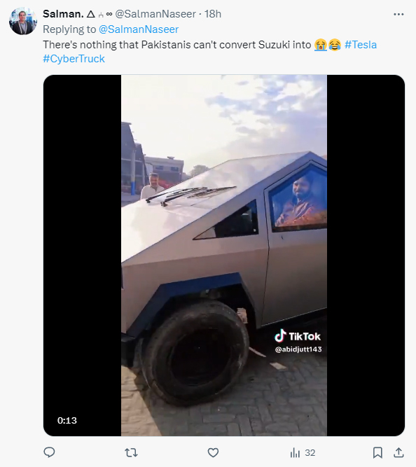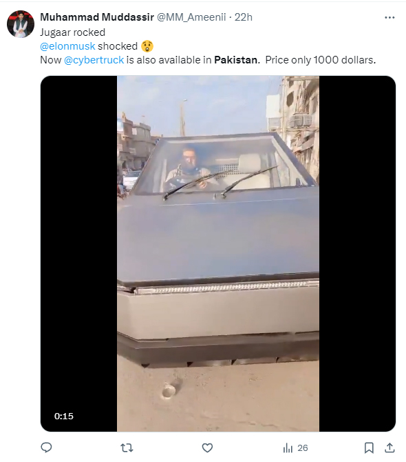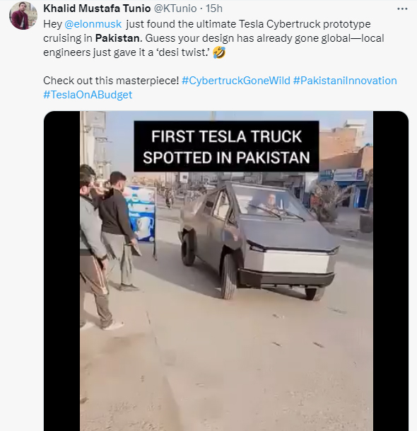 محمد مدثر نے کہا ’جگاڑ راکڈ، ایلون مسک شاکڈ۔ سائبر ٹرک اب پاکستان میں بھی دستیاب، قیمت صرف 1 ہزار ڈالر۔‘