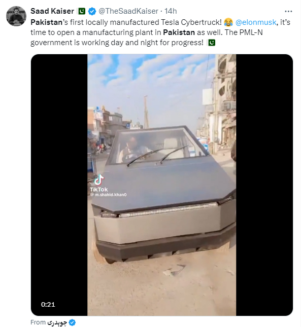 سعد قیصر نے اپنی پوسٹ میں لکھا ’پاکستان کا پہلا لوکل تیار کردہ سائبر ٹرک۔ ایلون مسک اب یہ وقت ہے پاکستان میں مینوفیکچرنگ پلانٹ کھولنے کا۔ حکومت دن رات محنت کر رہی ہے۔‘