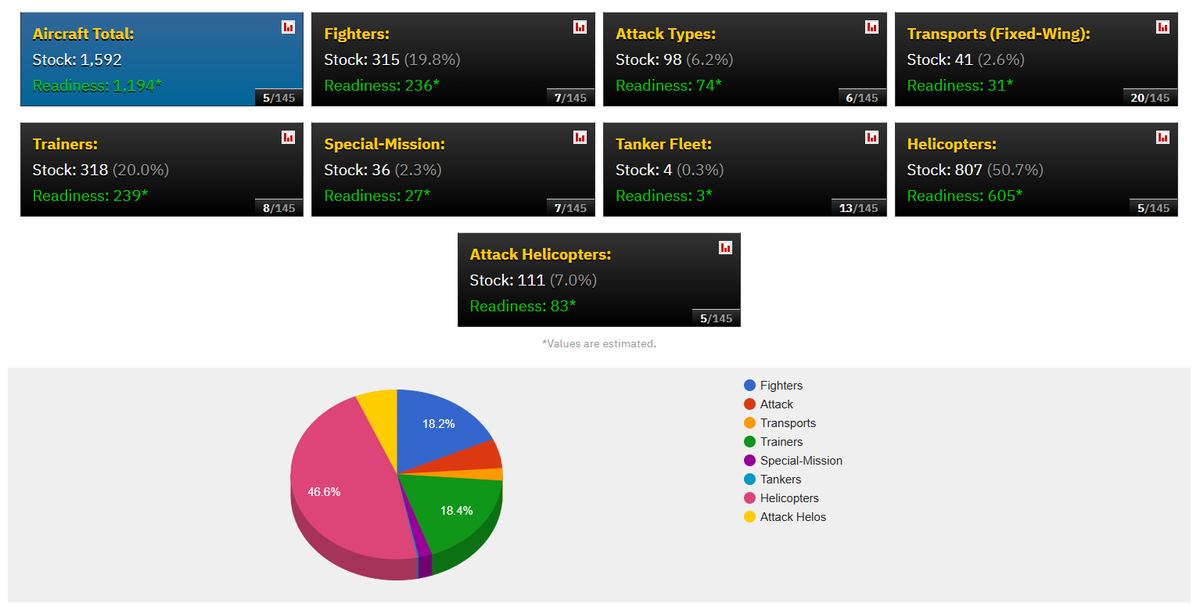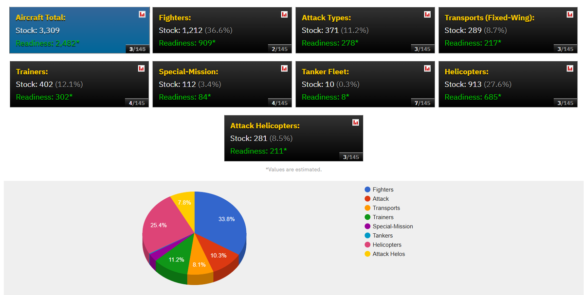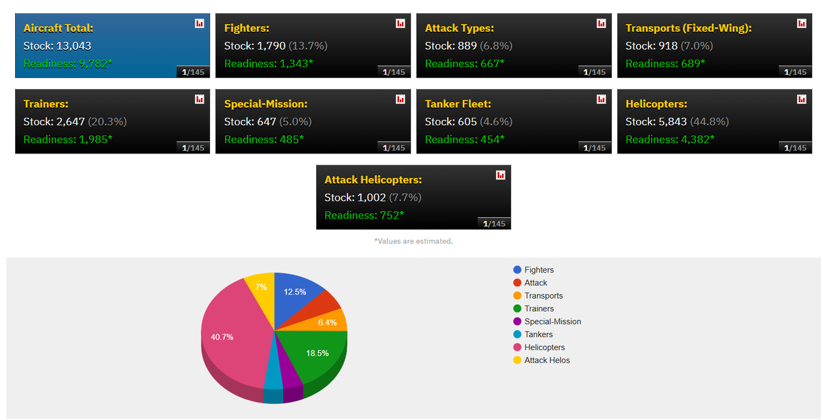 امریکہ کے پاس 5843 ہیلی کاپٹر، 1790 فائٹر طیارے، 889 اٹیک ٹائپس، 918 ٹرانسپورٹ طیارے، 2647 ٹرینر طیرے، 647 سپیشل مشن طیارے، 605 ٹینکر فلیٹ اور 1002 اٹیک ہیلی کاپٹرز موجود ہیں۔