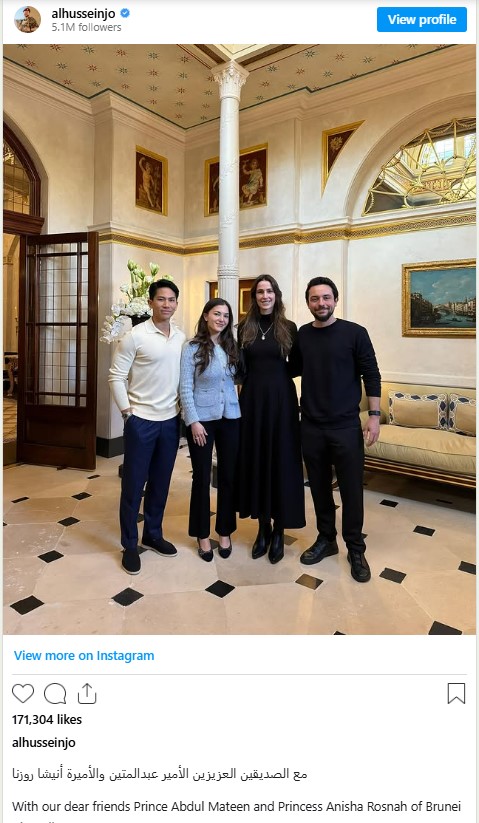 اردنی ولی عہد نے تصویر کے کیپشن میں لکھا’ ہمارے پیارے دوست برونائی کے شہزادے عبدالمتین اور شہزادی انیشیا روسنا کے ساتھ۔‘