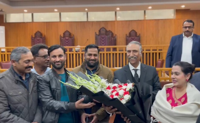 عدالتی عملے نے جسٹس سرفراز ڈوگر کو خوش آمدید کہا۔ (فوٹو: اردو نیوز)
