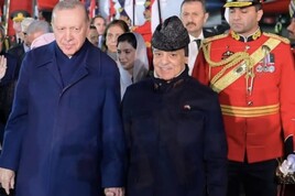 ترکیہ کے صدر رجب طیب اردوغان کی وزیراعظم ہاؤس آمد پر وزیراعظم شہباز شریف نے ان کا استقبال کیا اور مسلح افواج کے دستوں نے انہیں گارڈ آف آنر پیش کیا جبکہ فضائیہ کے طیاروں نے فلائی پاسٹ کیا۔