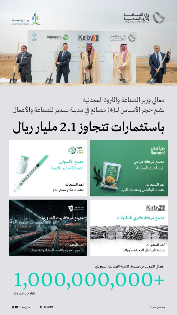 سعودی وزیر صنعت و معدنیات بندر الخریف نے جمعے کو سدیر سٹی فار انڈسٹری اینڈ بزنسز میں 4 فیکٹریوں کا سنگ بنیاد رکھا ہے جس میں سرمایہ کاری کا حجم 2.1 ارب ریال سے زیادہ ہے، صنعتی ترقیاتی فنڈ نے ایک ارب ریال سے زیادہ کی فنڈنگ کی ہے۔