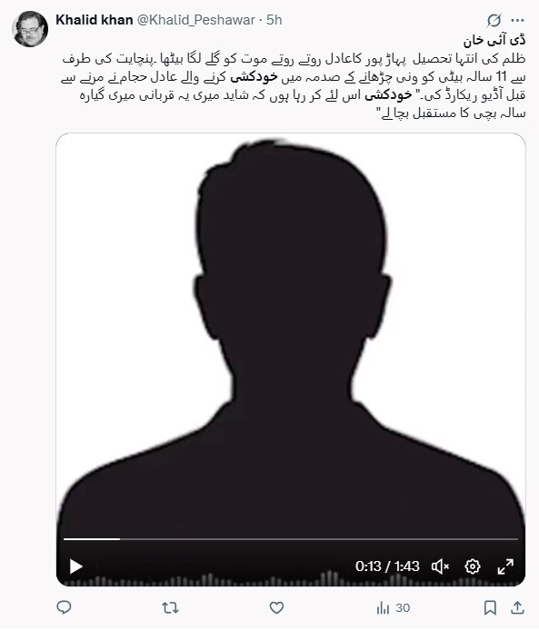 ایک اور صارف نے لکھا کہ ’چھ بیٹیوں کا باپ انصاف کی تلاش میں اپنی جان دے بیٹھا! ڈیرہ اسماعیل خان کے علاقے بگوانی شمالی میں پیش آنے والا واقعہ نہ صرف دل دہلا دینے والا ہے، بلکہ پورے معاشرے کے لیے ایک کڑا سوال بھی ہے۔‘
