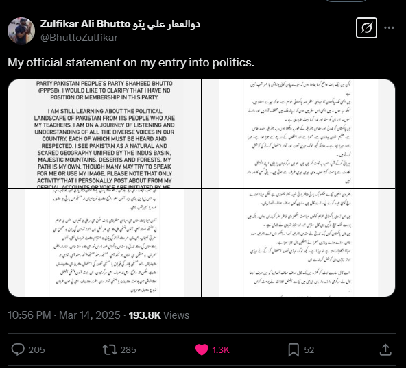 جمعے کی شب کو مختلف سوشل میڈیا پلیٹ فارمز پر ایک بیان میں ذوالفقار علی بھٹو جونیئر نے کہا کہ ’میرے بابا شہید میر مرتضیٰ بھٹو نے اپنے پیچھے ایک مضبوط سیاسی میراث چھوڑی ہے جو عوام کے ذریعے عوام کے لیے سیاست تھی۔‘