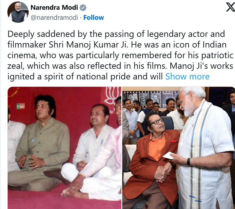 وزیراعظم نریندر مودی نے منوج کمار کے انتقال کی خبر اپنے ایکس اکاؤنٹ پر شیئر کرتے ہوئے انہیں ’لیجنڈری ایکٹر اور فلم میکر‘ قرار دیا۔