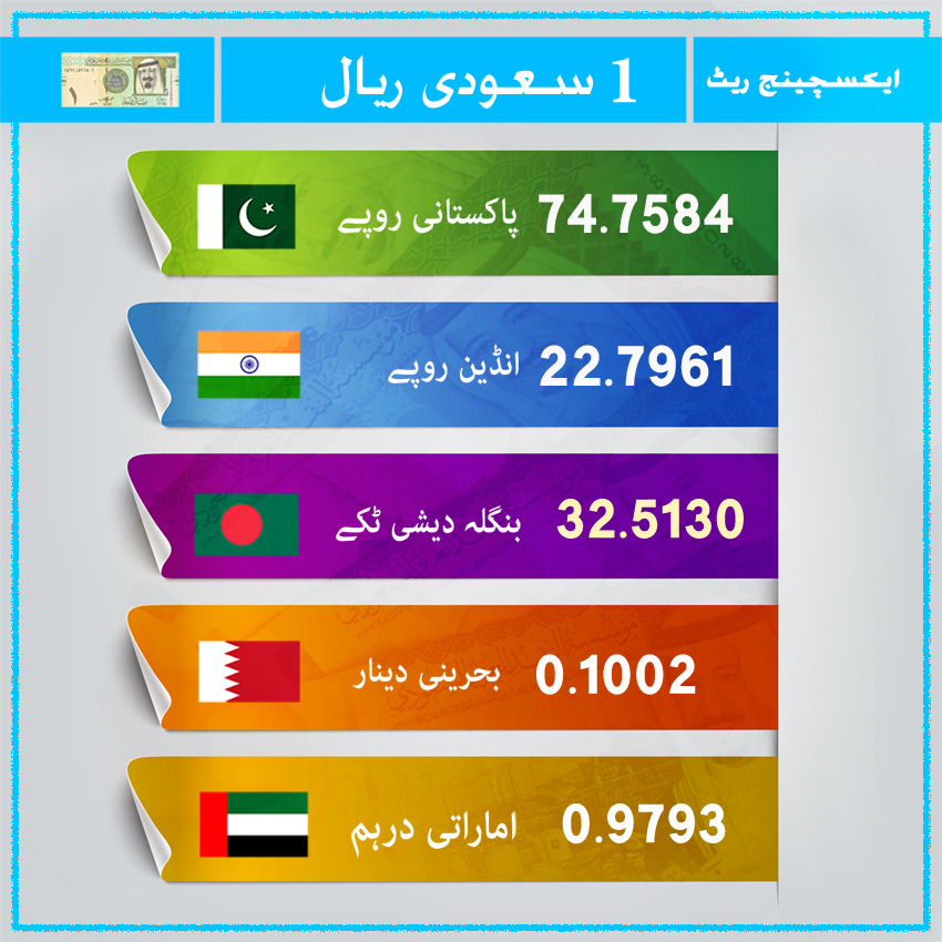 سعودی عرب کے مختلف ٹرانزیکشن سنٹرز کے مطابق اتوار 06 اپریل 2025 کو سعودی ریال کا ایکسچینج ریٹ ذیل میں درج کیا گیا ہے۔