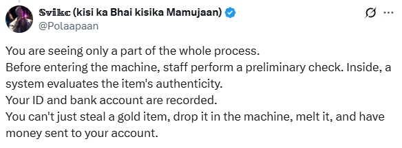ایک اور صارف نے تبصرہ کیا کہ ویڈیو میں جو آپ دیکھ رہے ہیں وہ پورے عمل کا ایک چھوٹا سا حصہ ہے، دراصل مشین میں سونا ڈپوزٹ کرنے سے قبل سٹاف اس کی تصدیق بھی کرتا ہے۔
