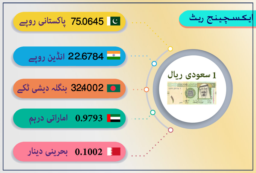 سعودی عرب کے مختلف ٹرانزیکشن سنٹرز کے مطابق پیر 12 مئی 2025 کو سعودی ریال کا ایکسچینج ریٹ ذیل میں درج کیا گیا ہے۔