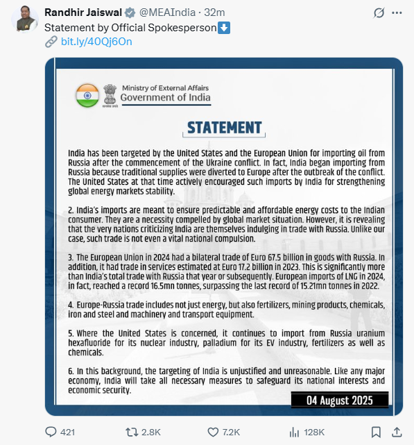 انڈین وزارت خارجہ کی جانب سے پیر کی شام جاری کردہ بیان میں کہا گیا کہ ’حقیقت یہ ہے کہ انڈیا نے روس سے درآمدات اس وقت شروع کیں جب روایتی سپلائیز یورپ کی طرف منتقل ہو گئیں۔ اُس وقت امریکہ نے انڈیا کو ایسی درآمدات کی حوصلہ افزائی کی تاکہ عالمی توانائی منڈیوں میں استحکام برقرار رکھا جا سکے۔‘