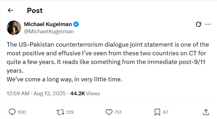 پاکستان اور امریکہ کے درمیان انسداد دہشت گردی کے حوالے سے تازہ ترین مذکرات کے دور اور اس کے اعلامیے پر جنوبی ایشیا کے امور کے ماہر فارن پالیسی میگزین سے وابستہ مائیکل کوگلمین نے ایکس پر لکھا کہ ’امریکہ اور پاکستان کے انسدادِ دہشت گردی (کاؤنٹر ٹیررازم) مذاکرات کے مشترکہ اعلامیے کا لہجہ کئی سالوں میں ان دونوں ممالک کے درمیان اس موضوع پر سب سے زیادہ مثبت اور پُرجوش نظر آتا ہے۔ یہ بیان بالکل اُن دنوں جیسا لگتا ہے جو نائن الیون کے فوراً بعد کے تھے۔