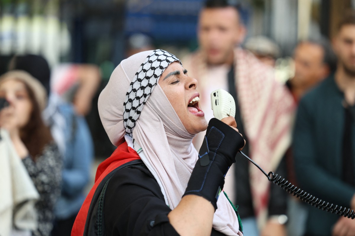 مظاہرے کے بعد شرکا نے ایک یادگاری تقریب منعقد کی، جس میں عزہ میں مارے گئے 200 سے زائد صحافیوں کے نام بلند آواز میں پڑھے گئے۔ (فوٹو: اے ایف پی)