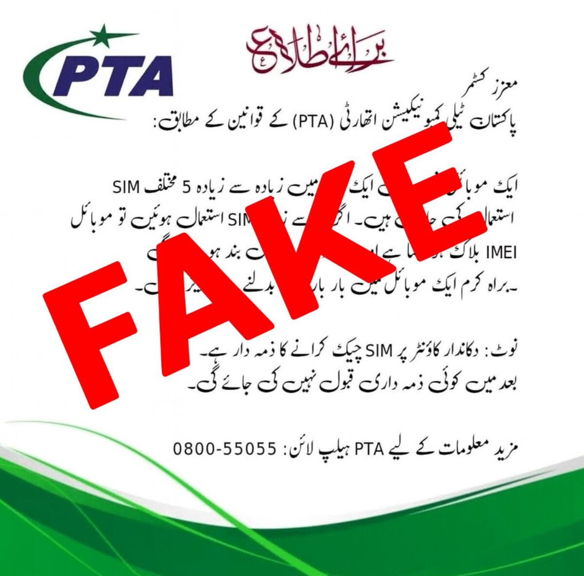 سوشل میڈیا پر پاکستان ٹیلی کمیونیکیشن اتھارٹی (پی ٹی اے) کے نام سے منسوب ایک جعلی نوٹیفکیشن گردش کر رہا ہے جس میں دعویٰ کیا گیا ہے کہ ایک موبائل فون میں ایک ماہ کے اندر پانچ سے زائد سمز استعمال کرنے پر فون بلاک کر دیا جائے گا۔