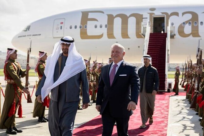 متحدہ عرب امارات کے صدر شیخ محمد بن زاید آل نہیان نے پیر کو ابوظبی میں اردن کے شاہ عبداللہ دوم کا خیرمقدم کیا ہے۔