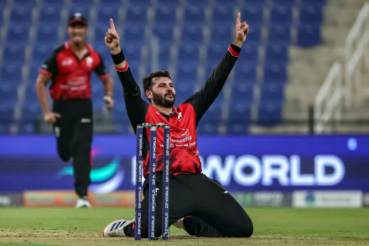 ہانگ کانگ کی جانب سے کنچت شاہ اور ایوش شکلا نے دو، دو وکٹیں حاصل کیں۔ (فوٹو: اے ایف پی)