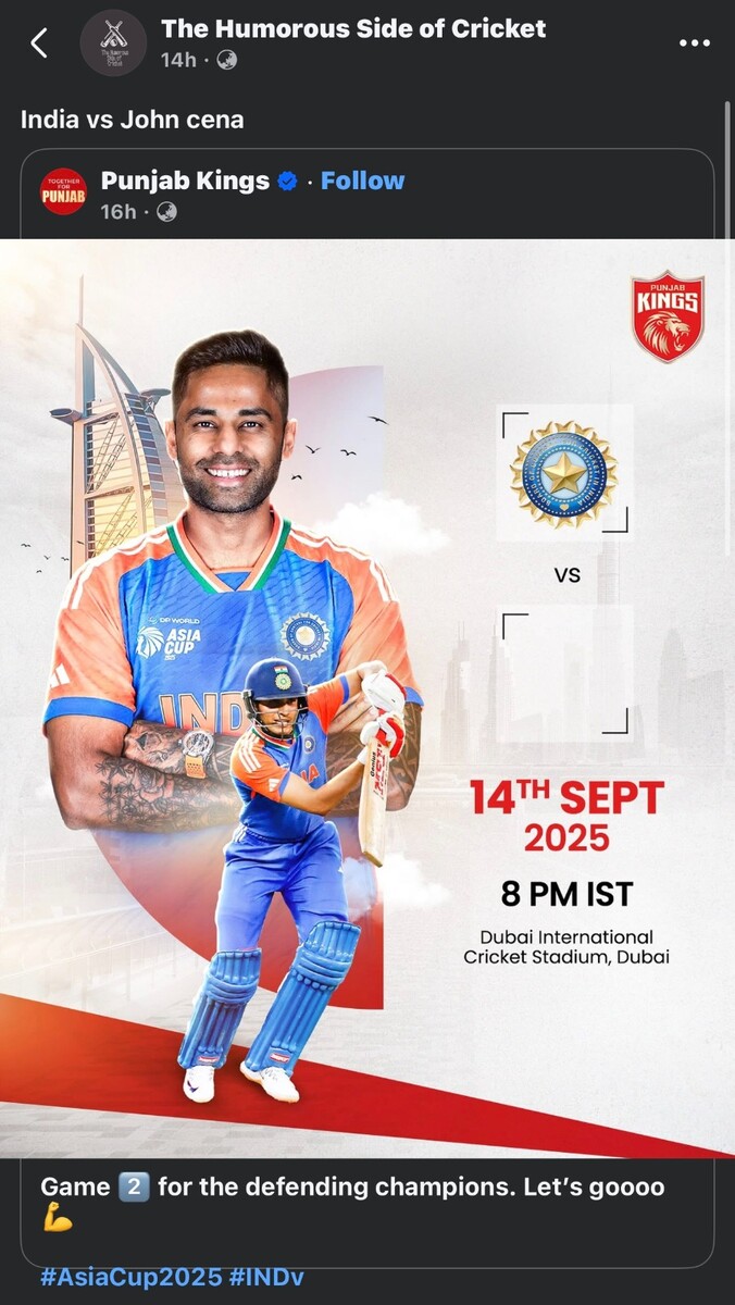 اس پوسٹ میں 14 ستمبر کو انڈیا پاکستان میچ کا ایک پوسٹر ڈیزائن کیا گیا تھا جس میں انڈیا کا مقابلہ پاکستان سے شیڈول ہے، مگر پوسٹر میں پاکستان ٹیم کا کوئی ذکر یا تصویر ہی شامل نہیں کی گئی۔