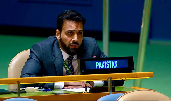پاکستانی سفارت کار سیکنڈ سیکریٹری محمد راشد کا کہنا تھا کہ ’بین الاقوامی قوانین کی خلاف ورزی انڈیا کی عادت بن چکی ہے۔‘ (فوٹو: ایکس پاکستان یو این)