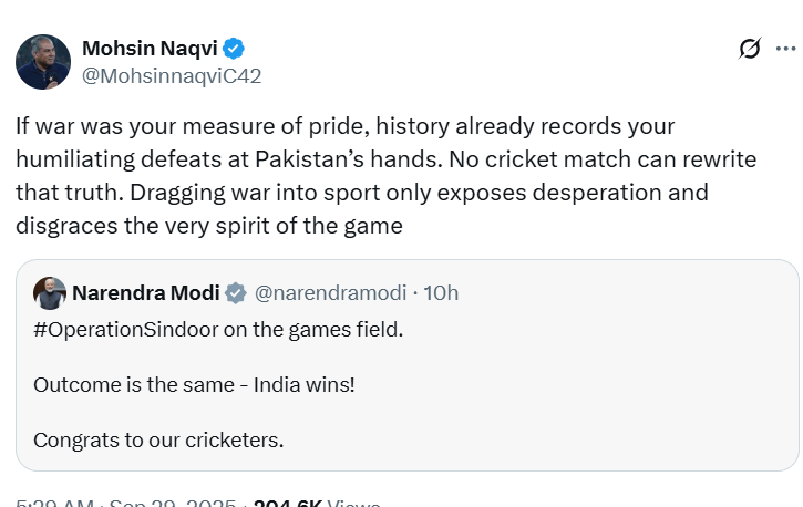 کھیل میں جنگ کو گھسٹینا مایوسی کو ظاہر کرتا ہے: محسن نقوی کا نریندر مودی کو جواب