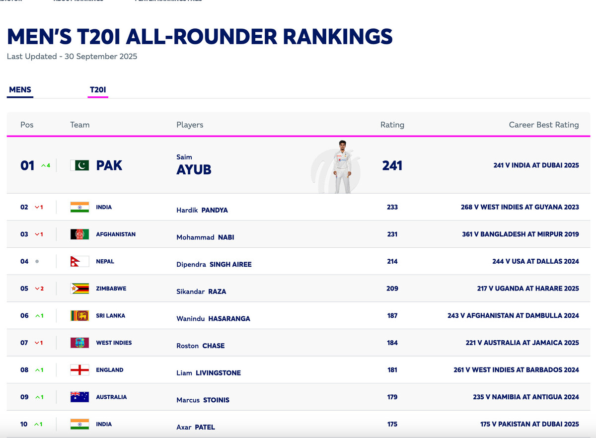 ہاردک پانڈیا جو اس سے پہلے دنیا کے نمبر ون ٹی 20 آل راؤنڈر تھے اب فہرست میں دوسرے نمبر پر آچکے ہیں جبکہ صائم ایوب جن کا ایشیا کپ 2025 انتہائی مایوس کن رہا نے رینکنگ میں چار درجے ترقی کی ہے۔