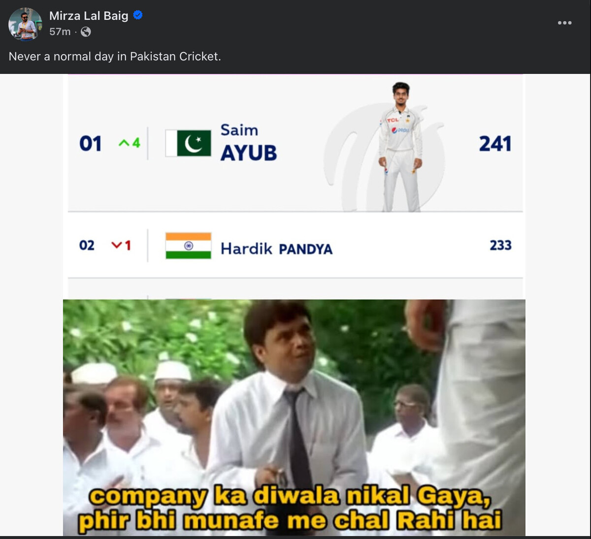 مرزا لال بیگ نامی صارف نے فیس بک پر پوسٹ کرتے ہوئے ایک مشہور فلمی ڈائیلاگ لکھا ’کمپنی کا دیوالیہ نکل گیا مگر پھر بھی منافع میں چل رہی ہے۔‘