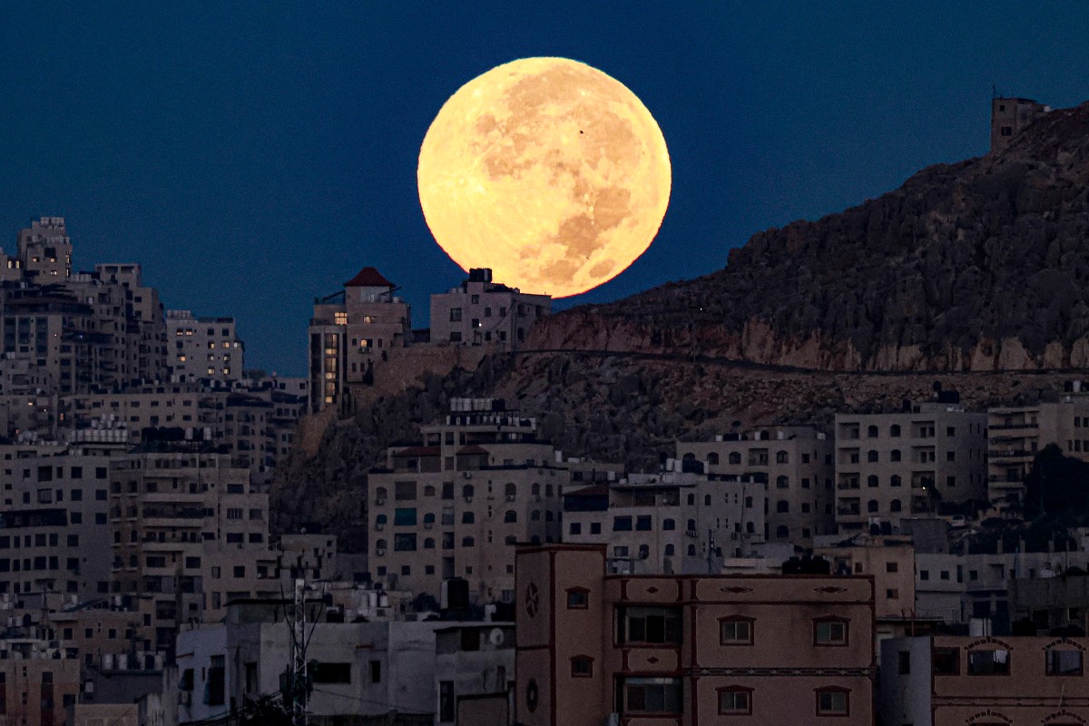 فُل مون فلسطین کے شہر نابلس کے عقب میں جبل عیبال پر سنہری روشنیاں بکھیر رہا ہے