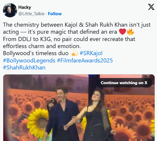 ایک اور سوشل میڈیا صارف نے لکھا کہ ’کاجول اور شاہ رخ خان کے درمیان کیمسٹری صرف اداکاری نہیں، بلکہ ایک خالص جادو ہے جس نے ایک پوری نسل کی شناخت بنائی۔ دل والے دلہنیا لے جائیں گے سے لے کر کبھی خوشی کبھی غم تک، کوئی جوڑی اس بے ساختہ دلکشی اور جذبات کو دوبارہ تخلیق نہیں کر سکی۔ بالی ووڈ کی لازوال جوڑی۔‘